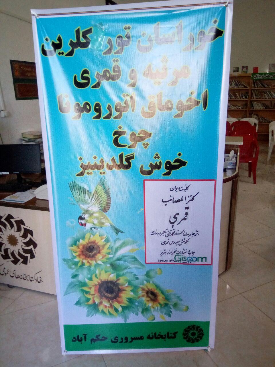 گوشه هایی از مراسم ادبی مذهبی مراثی ترکی و قمری خوانی در کتابخانه مسروری حکم آباد به همت آقای ملکوتی که با حضور پرشور مردم روبرو شد به طوری که جا برای نشستن نبود. در این نشست دو ساعته آقایان جمشیدی فرماندار. محترم جوین، حاج علیرضا کیامنش رییس آموزش و پرورش جوین، آقای برغمدی بخشدار بخش عطاملک، آقای محمدی رییس بنیاد شهید جوین، امام جماعت مسجدهای خرم اباد و حکم اباد و شاعران و علاقمندانی از کلات نادری، بجنورد، صفی آباد، خوشاب و نیشابور اشعاری از کلیات محمدتقی قمری گلزار دربندی را قرائت کردند. در این مراسم آکنده از معنویت اشک در چشم بعضی از خوانندگان اشعار و حضار حلقه زده بود .کل این مراسم از طرف برنامه آیدنلق تلویزیون ترک خراسان شمالی فیلم برداری شد که از این برنامه پخش خواهد شد. انجمن ادبی ترک های خراسان در این مراسم حضوری فعال داشتند.
