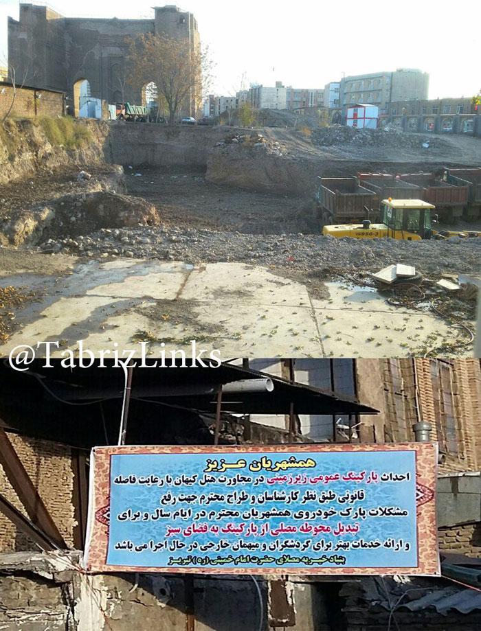 -مصلای تهران را انسان مشاهده می کند غبطه می خورد با انتخاب مکان صحیح و سالن های زیبا و فضای سبز گسترده و....-حال همه اینها به کنار در باقی مانده محوطه ارک اقدام به خاکبرداری جهت ساخت پارکینگ شده و چون اعتراض ها بلند شده برای لوث کردن قضیه از سازمان میراث فرهنگی خواسته شده وارد میدان شود و قضیه را توجیه کند راستی چرا در هیچکدام از شهرهای فارس زبان حتی شهر های کوچک کویری این چنین مغلطه هایی در رابطه با آثار باستانی حتی برای نمونه یک بار هم صورت نمی گیرد- ساخت و ساز غیر مجاز در حریم آثار باستان تبریز و تخریب قسمتی از آنها مانند همین ارک مسجد کبود قلعه رشدیه -میدان صاحب الامر -مقبره الشعرا و...باعث شدند این آثار را دیگر نتوانیم در فهرست جهانی ثبت شوند و...
